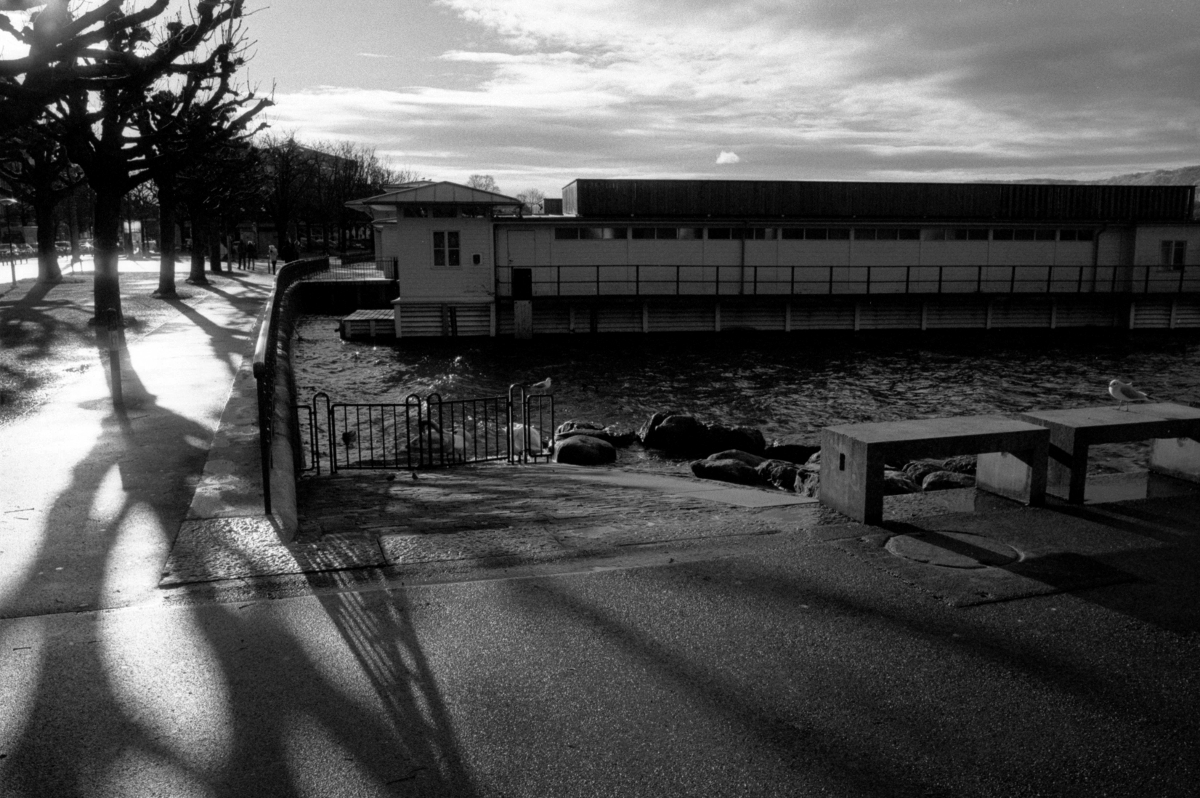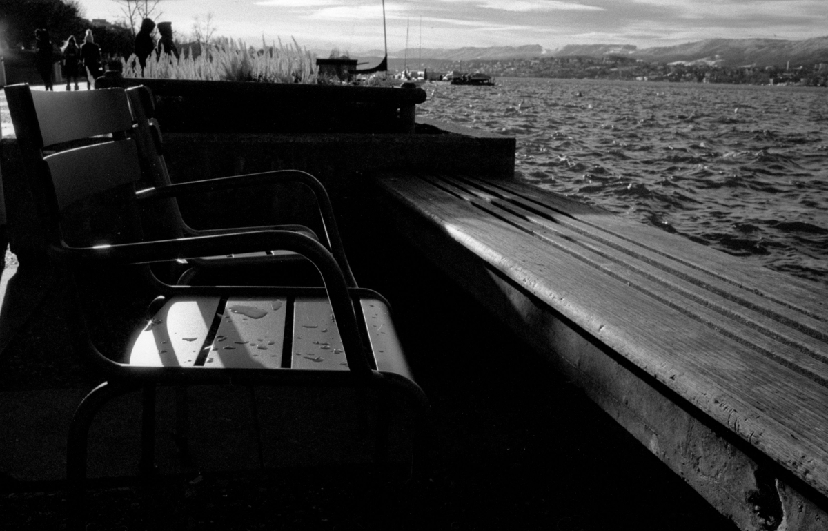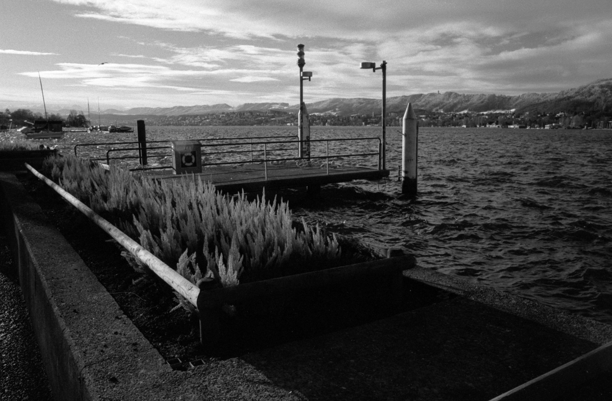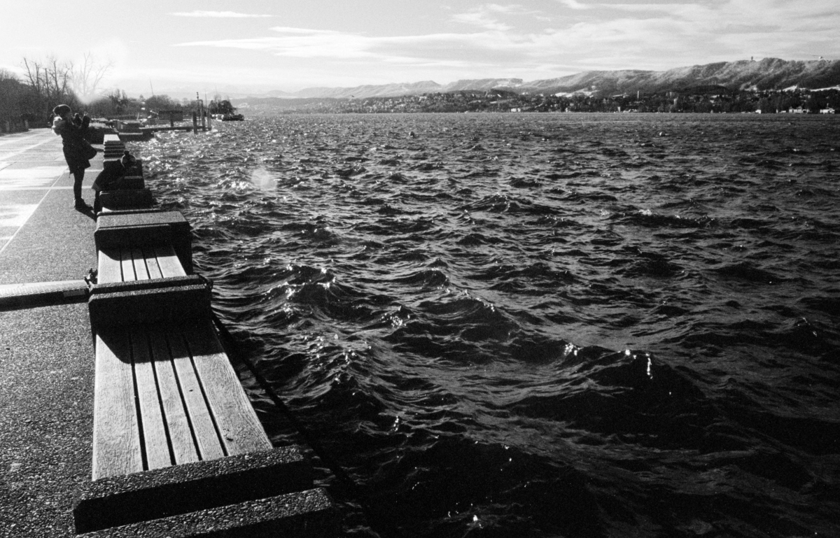 Es kommt anders als geplant. Und zwar noch erstaunlich oft, wie wir alle wissen. Eigentlich wollten wir heute mit dem Auto zum Greifensee fahren und dort ein wenig nach dem Rechten sehen, sprich: ein Weilchen Spazierengehen. Doch der gestrige Schneefall, der so nicht vorhergesagte Frost und die daraus resultierenden Strassenverhältnisse, machen so gar keine Lust auf diese Unternehmung. Ergo mache ich mich an diesem Morgen mit der Konica, dem Weitwinkelobjektiv samt Orangefilter, und einem Schwarzweissfilm zu Fuss auf den Weg.   Dieses zu Fuss hat aber auch seine Tücken. Die Gehwege sind überfroren und das Laufen auf eben jenen ist nicht ohne. Ich schaffe es bis zur nächsten Tramhaltestelle und lasse mich dann zum See kutschieren. Hier sind die Wege frei, die Sonne kommt durch die Wolken, das Wasser ist tiefblau und der Uetliberg ist verschneit. Nur der Wind, der hat es heute in sich.
