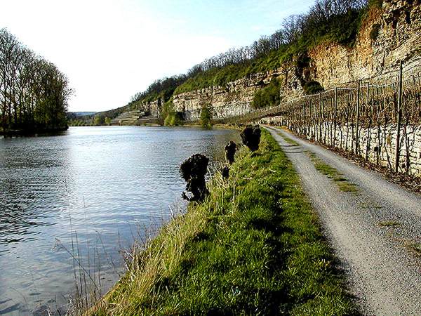 Kraftwerke im trauten Nebeneinander mit Weinbergen, weidengesäumten