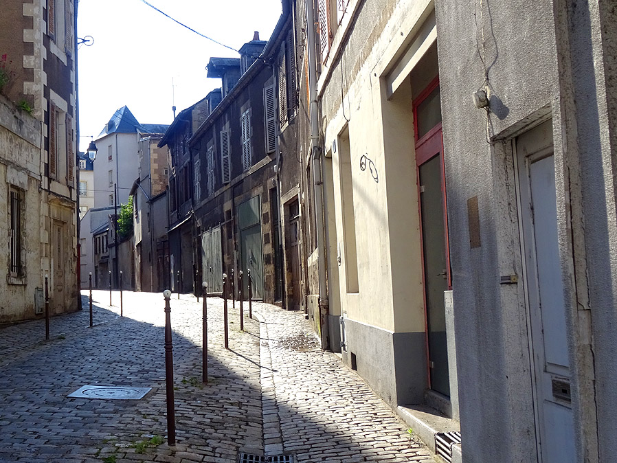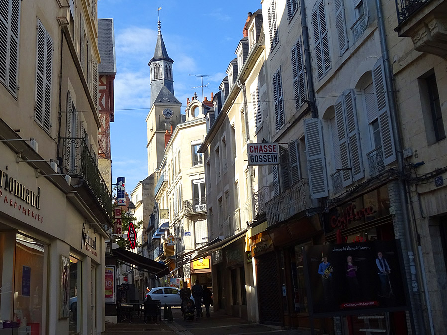 Bei Fleury ist Schluss mit dem gut befahrbaren Treidelpfad. Auf uns wartet die Landstrasse, die über ein welliges Profil führt. Ein paar Kilometer vor Nevers hat uns dann der Kanal wieder, etwas später rollen wir über die grosse Loirebrücke und klettern auf der anderen Flussseite schmale Altstadtgassen hinauf zur Kathedrale und dem Herzogspalast und der Touristeninfo. Denn heute haben wir kein Zimmer reserviert und wollen mal schauen, was sie uns dort empfehlen. Sie empfehlen uns das Hotel Villa du Parc, das ganz in der Nähe am - Nomen est Omen - Parc Roger Salengro liegt. Wir werden nicht direkt im Hotel einquartiert, sondern in einem freistehenden kleinen Häuschen im Hinterhof. Muss man auch mal gesehen haben, sowas. Bisher waren wir schon zweimal in Nevers. Einmal diente die Stadt als Startpunkt, das zweite Mal markierte sie den Endpunkt einer Reise. So richtig besichtigt haben wir sie aber noch nicht. Das tun wir heute. Und zwar ausgiebig. Wir geniessen das bunte Licht, dass die Nachmittagssonne durch die Glasfenster der Kathedrale schickt, sitzen lange vor einer Brasserie im Freien und lassen das Treiben auf uns wirken, streunen durch die Gassen der Stadt und finden schliesslich und endlich ein Geschäft, in dem ich eine neue Kamera kaufe. |