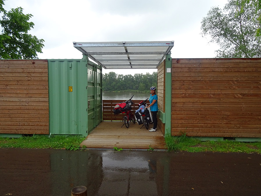 Wieder liegt heute Nebel über dem Land, und wieder wird er sich bis zu unserem Aufbruch gelichtet haben. Ab heute kommt der blaue BIKELINE-Führer "Loire-Radweg" zum Einsatz, der die Route ab Nevers beschreibt. Er dient uns allerdings nur als Anregung, und wir befolgen die dort verzeichnete Streckenführung nicht strikt, sondern "leisten" uns die ein oder andere Abweichung oder Abkürzung. Anstatt die im Führer beschriebene Route am südlichen Flussufer zur Mündung des Allier zu nutzen, radeln wir lieber gleich nach Nordwesten aus der Stadt. Viel Autoverkehr ist am heutigen Christi Himmelfahrtstag nicht zu verzeichnen. Man fährt halt zum Boulanger und holt sich sein Baguette. Wir setzen bei Fourchambault über die Loire und finden bei Givry dann die Beschilderung "Loire â velo" vor. Seit wir damals, vor bald zwölf Jahren, hier entlang gefahren sind, hat sich diesbezüglich einiges getan. Die Beschilderung und die Routenführung ist heutzutage so, wie man es von den Radfernwegen in Deutschland - beispielsweise dem Donauradweg - her kennt. Auf Asphalt gleiten wir nach Norden, können links über das Land blicken und haben rechts von uns reichlich Auwaldvegetation. Ab und zu sehen wir den Fluss, zum Beispiel bei Marseilles-lès-Aubigny, wo wir am Flussufer Pause machen. Es ist mittlerweile veränderlich bewölkt und gerade als wir unseren Tagesproviant plündern, zieht eine dunkle Wolkenfront heran. Ich weiss bis heute nicht, was das für ein Container oder für eine (Umkleide?)Kabine mit kleinem Glasdach war, die in unmittelbarer Nähe stand. Aber angesichts des plötzlich einsetzenden Platzregens kommt diese Unterstellmöglichkeit wie gerufen. |