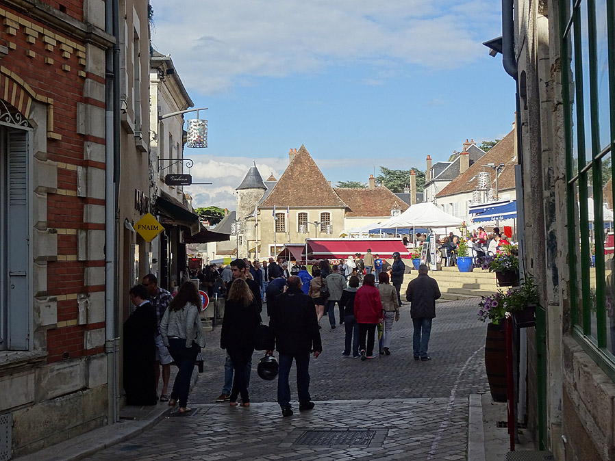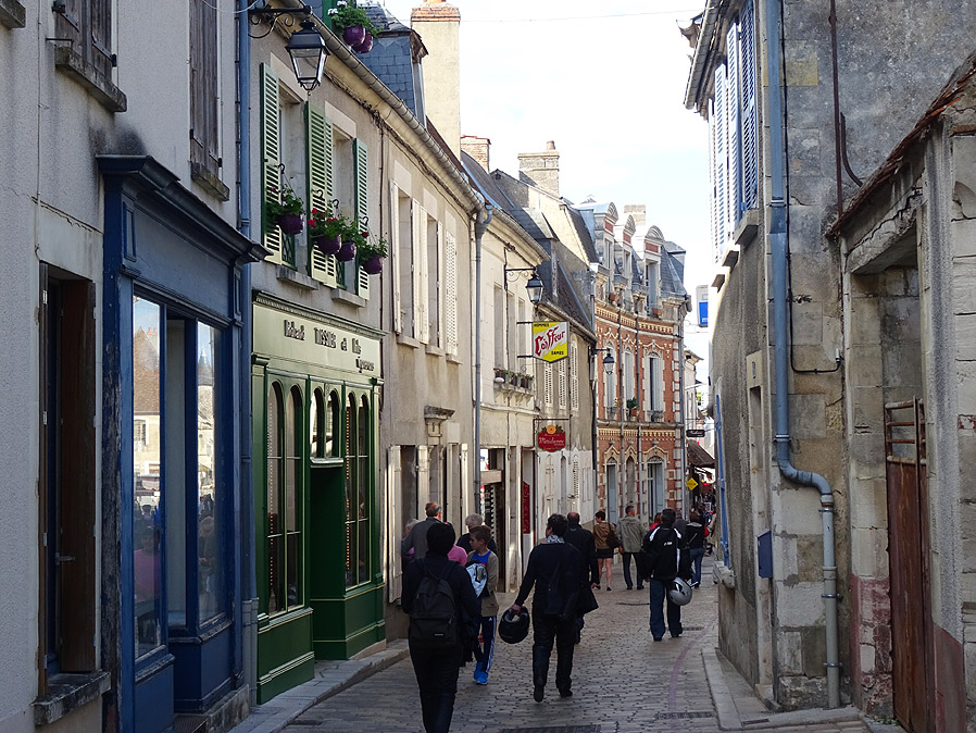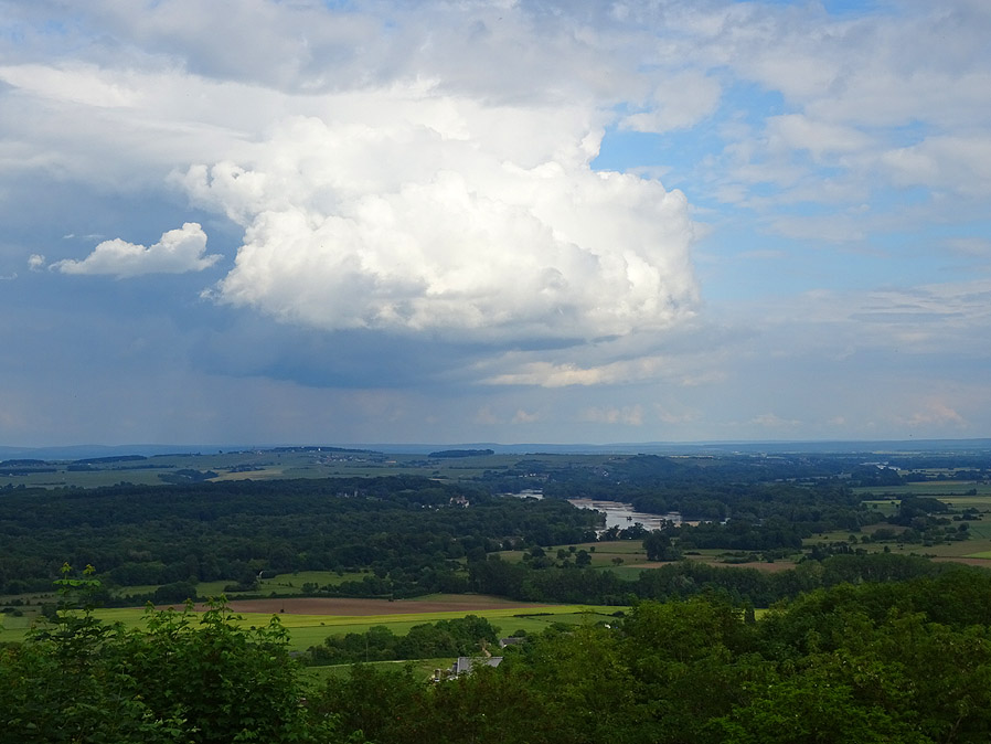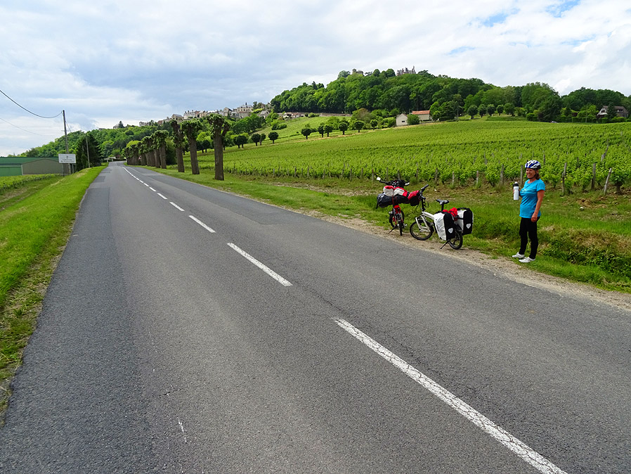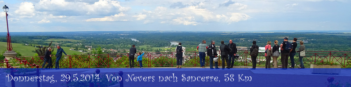 Der Spuk ist schnell vorbei und wir radeln weiter, immer mit guter Oberfläche unter den Reifen. Wir kommen trotz gelegentlicher Regenschauer gut voran. Am anderen Ufer erscheint dann La Charité-sur-Loire, eine Steinbrücke lädt ein, zur Ortsbesichtigung den Fluss zu queren. Wir bleiben jedoch links-loirisch und unserem Weg bis zum Weiler Les Vallees treu, wo wir dann auf die Landstrasse wechseln. Unser Tagesziel, der auf einem Hügel erbaute Ort Sancerre, erscheint weithin sichtbar am Horizont. Während wir langsam näher kommen, fragen wir uns natürlich, ob sich die Anstrengung des Anstieges jetzt am Schluss der Etappe wirklich auszahlen wird. Er tut es! Von oben blickt man weit über das Land, die Weinberge, das Flusstal. Diesmal kommen wir wieder recht gediegen unter, und zwar im Hotel