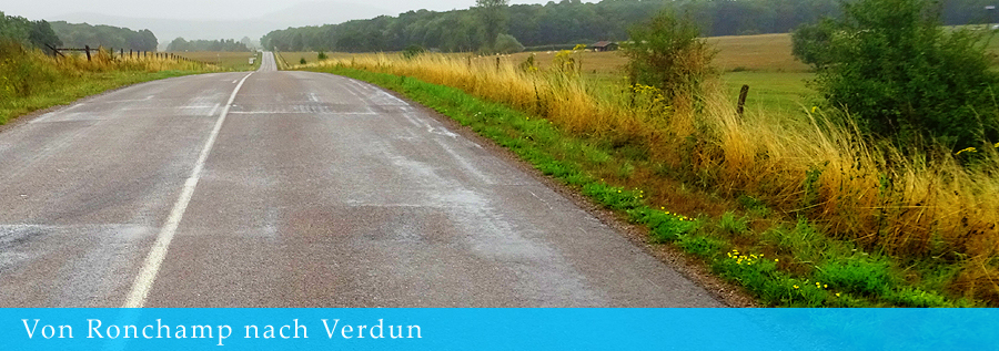 wohnt? Nur alte Menschen? Die dunkel bewaldeten Vogesen liegen hinter uns, von nun an prägt eine Landschaft mit weit auseinander liegenden Hügeln das Erscheinungsbild der Gegend. Wir folgen der Meuse. Prinzipiell wenigstens, denn die Landstrasse führt meistens über die Hügel am Talrand und nur ab und zu mal am Fluss entlang. Eigentlich ein schönes Terrain für eine Radreise. Das schreibe ich jetzt sogar aus Erfahrung, denn wir waren vor Jahren mal weiter nördlich an der Meuse unterwegs. Saint-Mihiel, mir noch in Erinnerung als Etappenort auf einer Reise während meiner Studentenjahre, hat Mühe, seine Kirche renoviert zu bekommen. Wert wäre sie es auf jeden Fall. Immerhin sind die bunten Kirchenfenster recht neu. Doch leider gesellt sich zu den vielen Farben der Glasfenster auch das Grün des Salpeters in den Wänden des Gebäudes. In Verdun lassen wir es für heute gut sein. Ein Hotel am Stadtrand