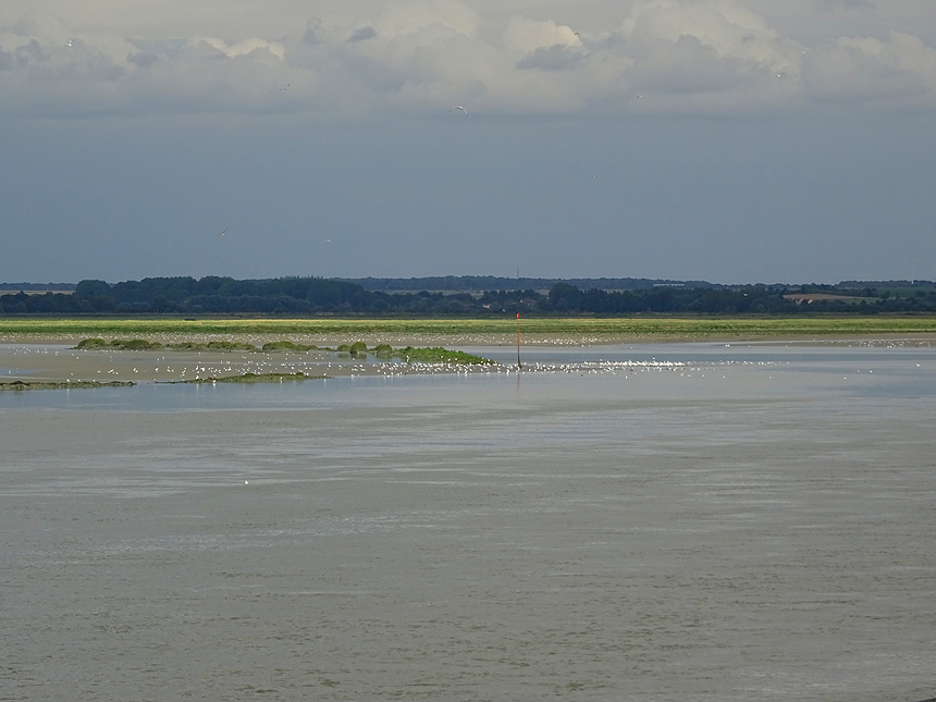 die Salzwiesen, den Fluss, hin zu den vielen Seevögeln, zu den Menschenmassen,