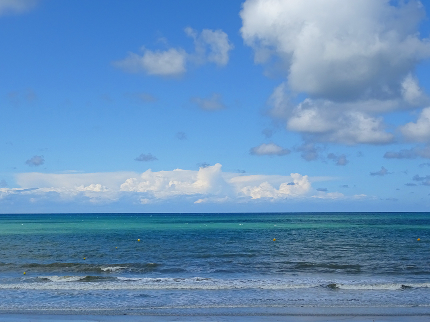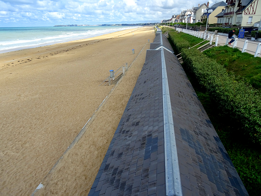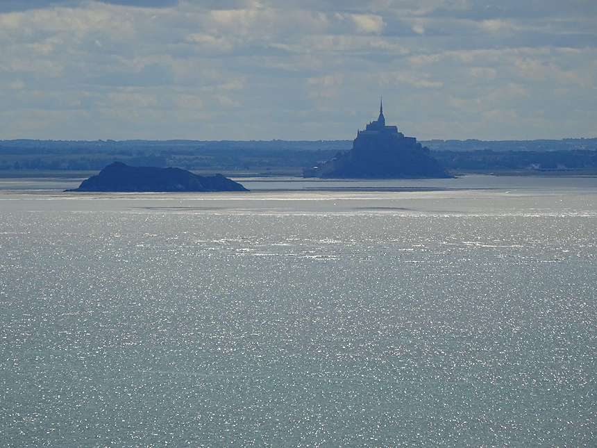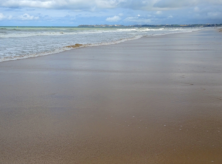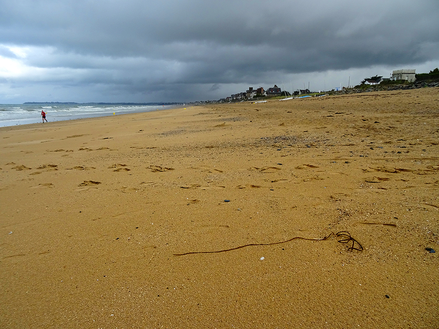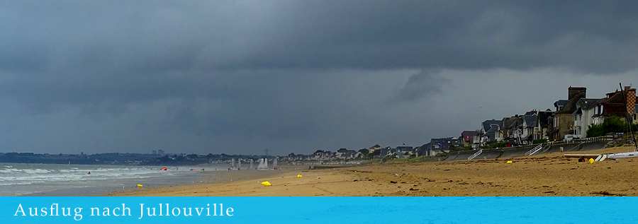 Kaum unterwegs, hört es auf zu regnen und das erste Stück azurblauen Himmels schimmert durch die Wolkendecke. Das weckt die Lust auf einen Ausflug. Wir fahren wieder auf die andere Seite der Bucht bis zum Badeort Jullouville, wo wir das erste Mal auf diese Reise wirklich am Meer sind. |
