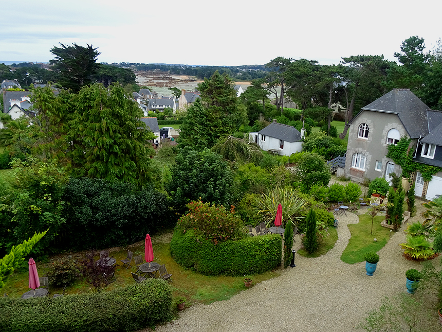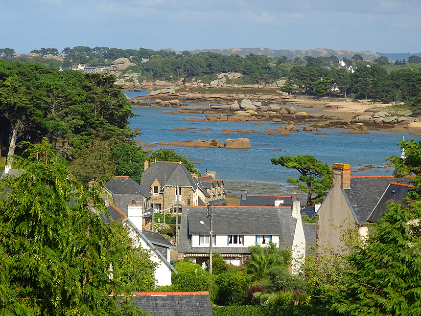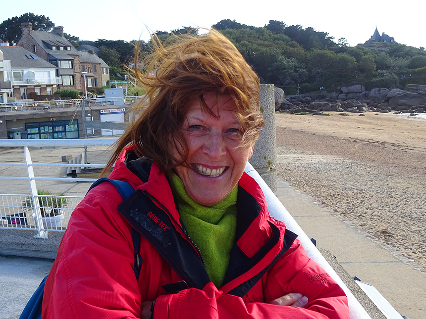 Allmählich wächst das Wetter zum Unwetter heran, es beginnt zu stürmen und regnet so stark, dass die Scheibenwischer auch in der höchsten Stufe den Fluten kaum mehr Herr werden. Mit Landschaftsgucken geht da nun wirklich nichts mehr, da schleicht man lieber mit reduziertem Tempo über die Landstrasse und ist froh über die Rücklichter des Vordermannes. Später sehen wir dann in den Nachrichten, was der Sturm im Norden der Bretagne angerichtet hat. Meine Güte! Erst nach der Siesta im Hotel macht das immer noch recht windige Wetter halbwegs Spass. Die Sonne hat nämlich am späten Nachmittag doch noch ein Einsehen und gibt sich ein Stelldichein. Und wenn man die typischen Häuser mit ihren saftig grünen Gärten, die dunkelgrünen Pinien, die grossen, runden Granitfelsen vor dem blauen Meer sieht, weiss man plötzlich wieder, warum man die Gegend hier so mag.