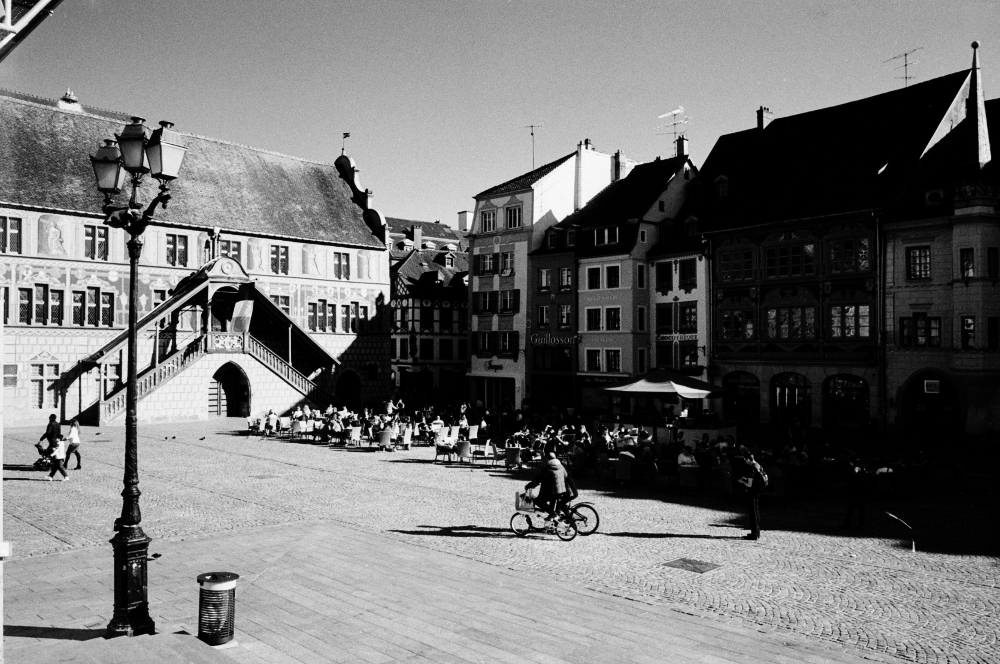 Wenigstens hielt sich am heutigen Sonntag der Verkehr in Grenzen. Generell hat uns der Rheinradweg bis Basel diesmal nicht so gut gefallen. Zuviel Autoverkehr, zuviel Industrie- und Gewerbegebiete, zu wenig ruhige Passagen. Es war eine Transitstrecke auf unserem Weg nach Westen, um wieder das Gefühl für das Radreisen zu bekommen. Im Laufe des Nachmittags nähern wir uns Mulhouse, inzwischen bei sommerlichen Temperaturen. Ein Hotel ist schnell gefunden. Den Rest des Tages verbringen wir, natürlich, besichtigender Weise. Es ist allerhand los hier in der Stadt, es ist Sonntag, es ist warm, da zieht es die Leute nach draussen. |