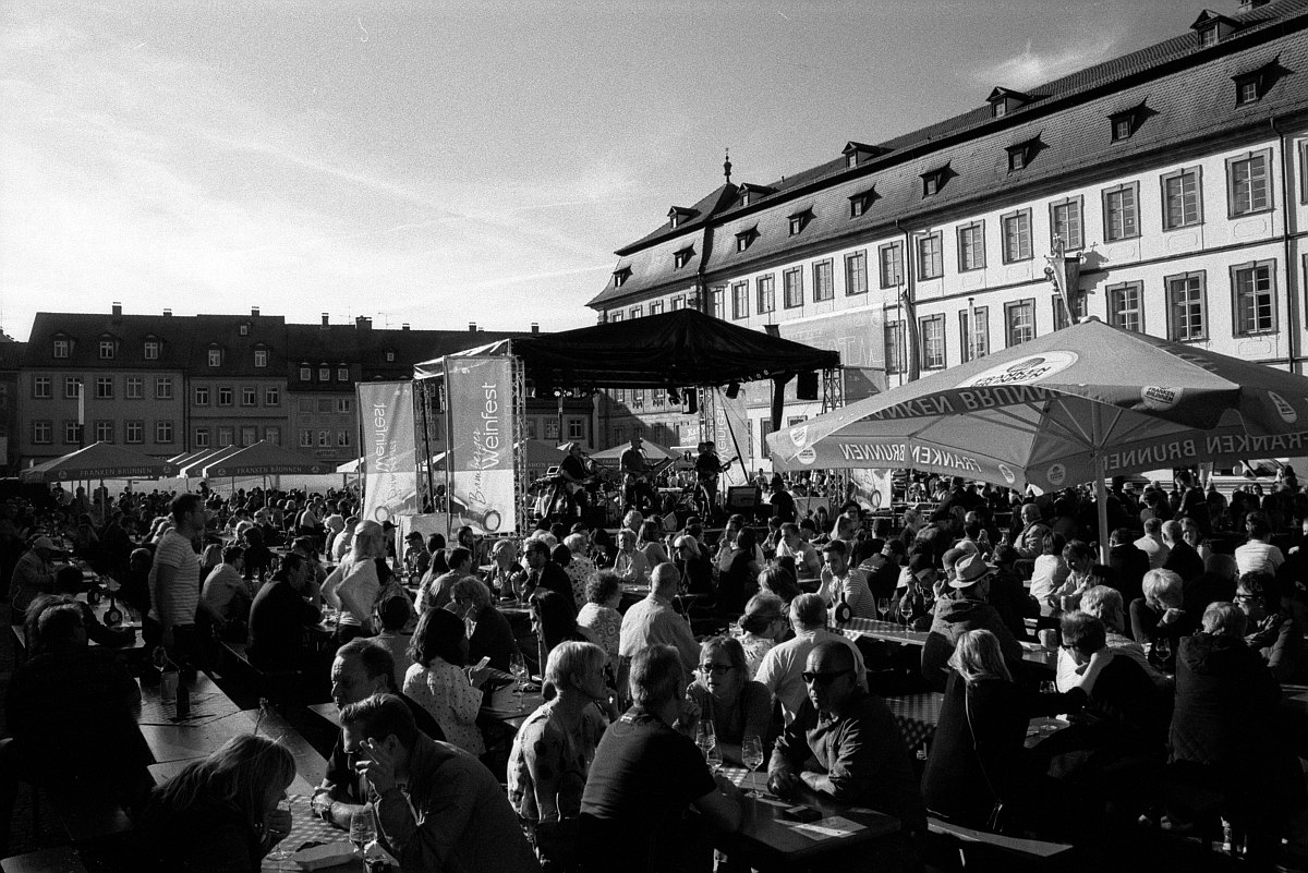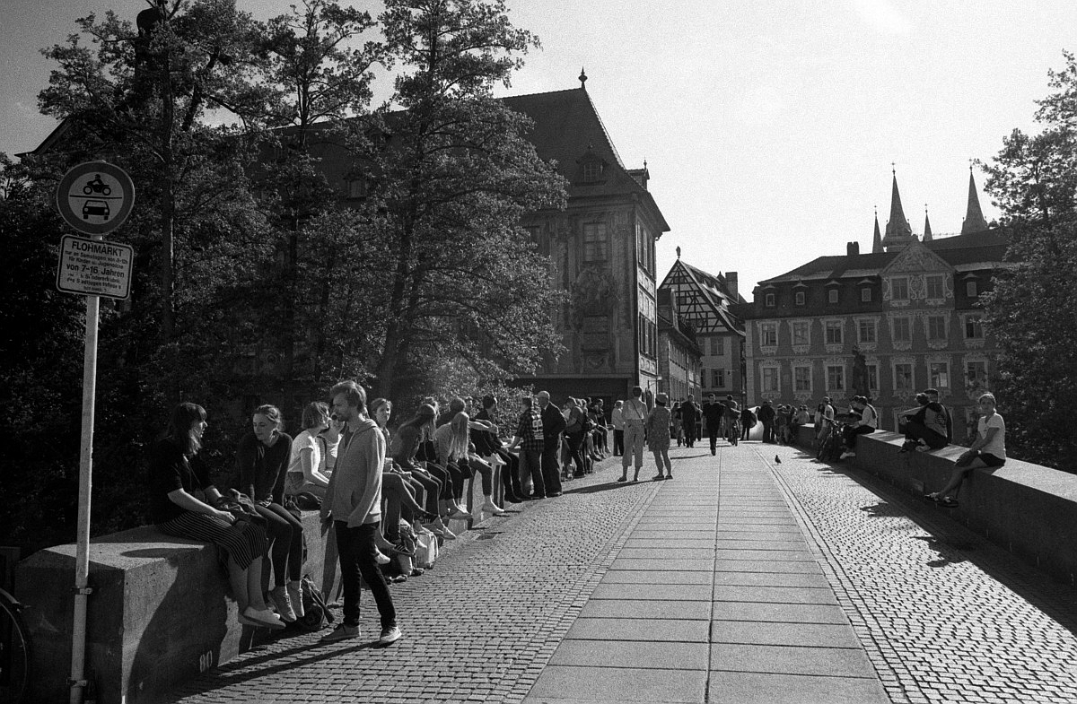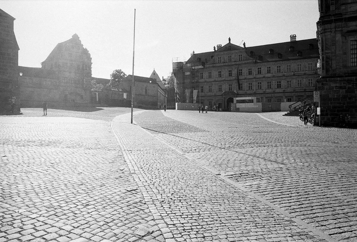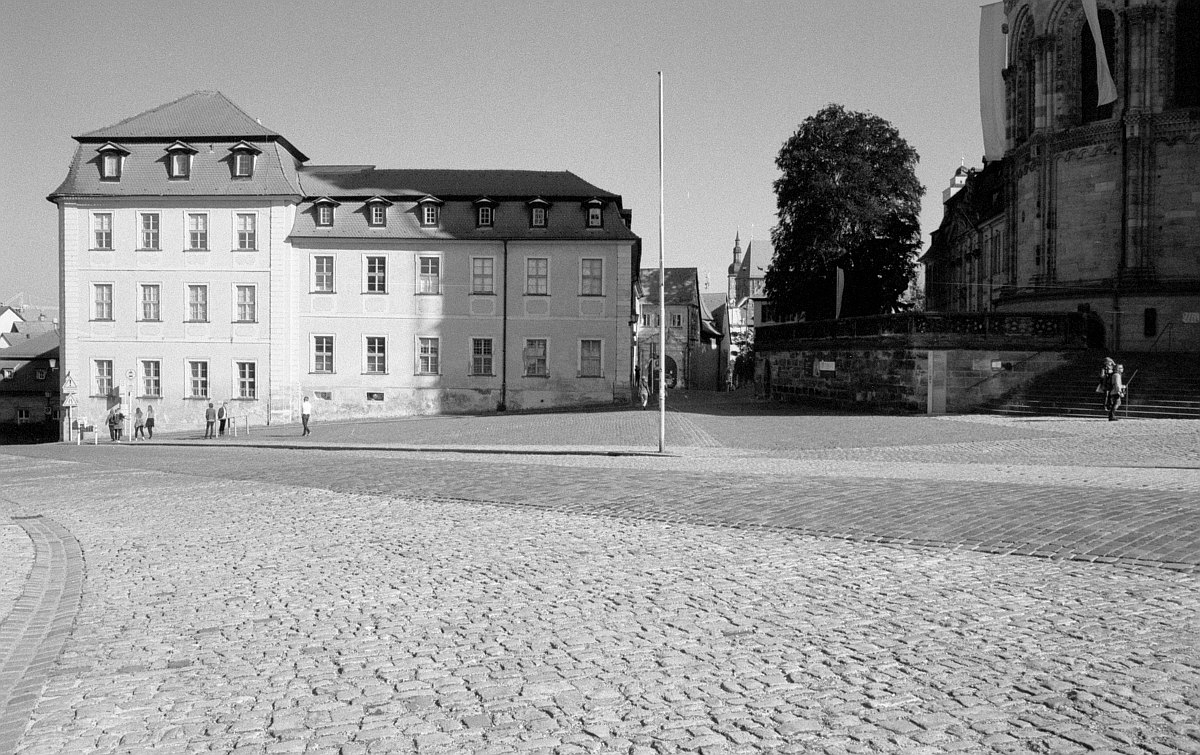 durch. Dass man müde ist, merkt man auch an der schwindenden Konzentration. Als ich vor unserem Hotel meine Lenkertasche vom Rad nehme, fällt mir prompt meine antike Minolta auf den Boden und handelt sich zwei unschöne Dellen ein. Immerhin funktioniert sie noch. Natürlich wandeln wir heute nach der Siesta noch durch Bambergs Gassen und Strässchen, die Stadt ist schliesslich ein Bijoux. Im Café Müller essen wir nicht nur hervorragend, eine Zwei-Mann-Band baut auch grad ihr Instrumentarium auf und intoniert zum Soundcheck "The Year of the Cat" von Al Stewart. Warum nur werden heute keine so geheimnisvoll-schönen Songs mehr geschrieben? Eine Weile später kommen wir noch in den Genuss einiger Beatles-Songs, die eine Band auf dem Weinfest in der Innenstadt spielt. |