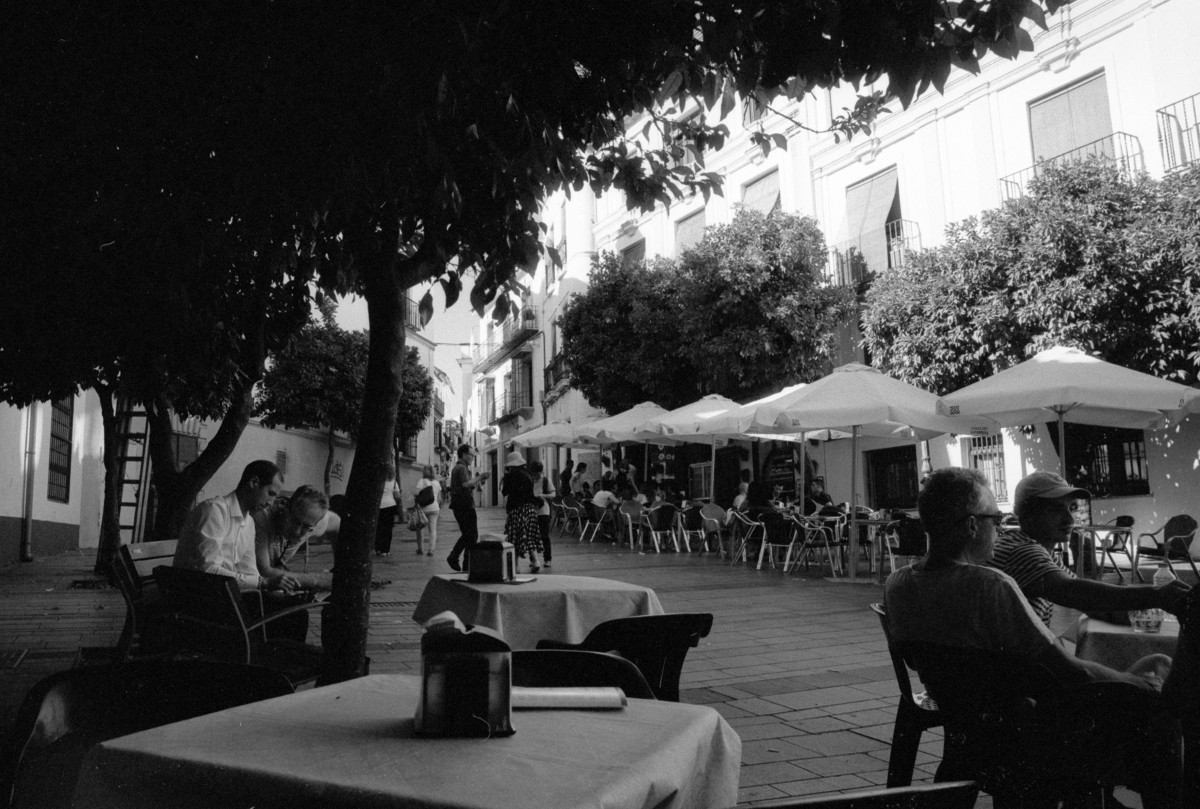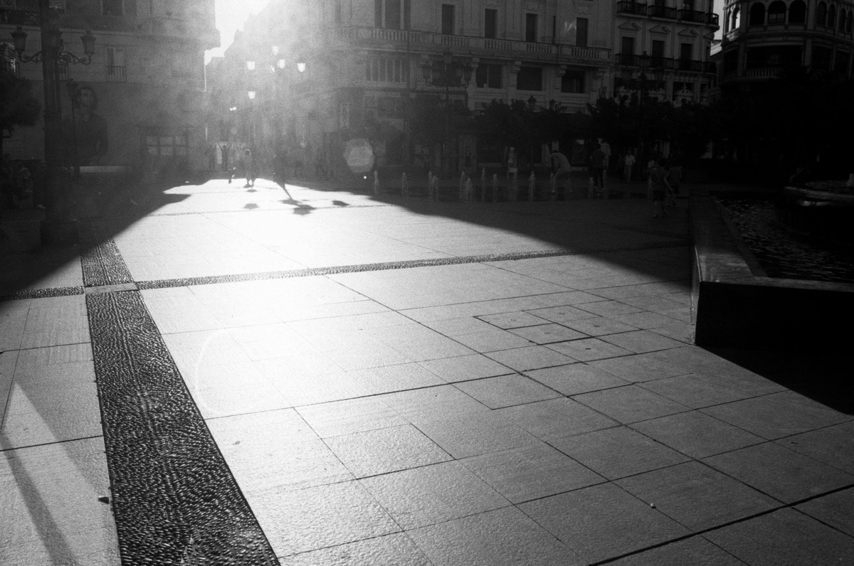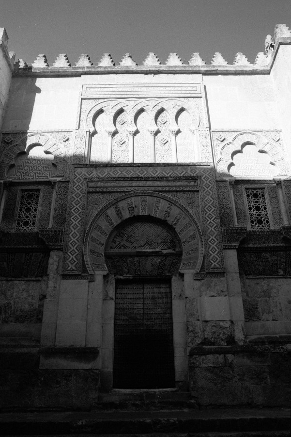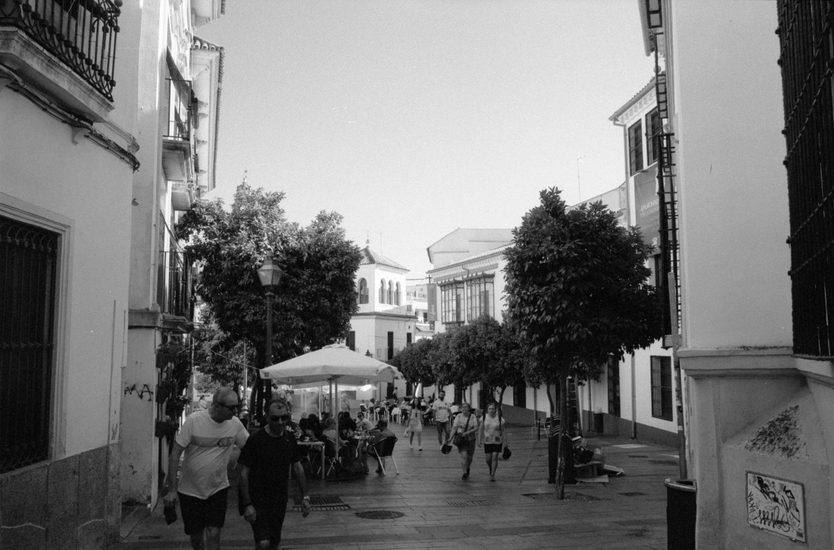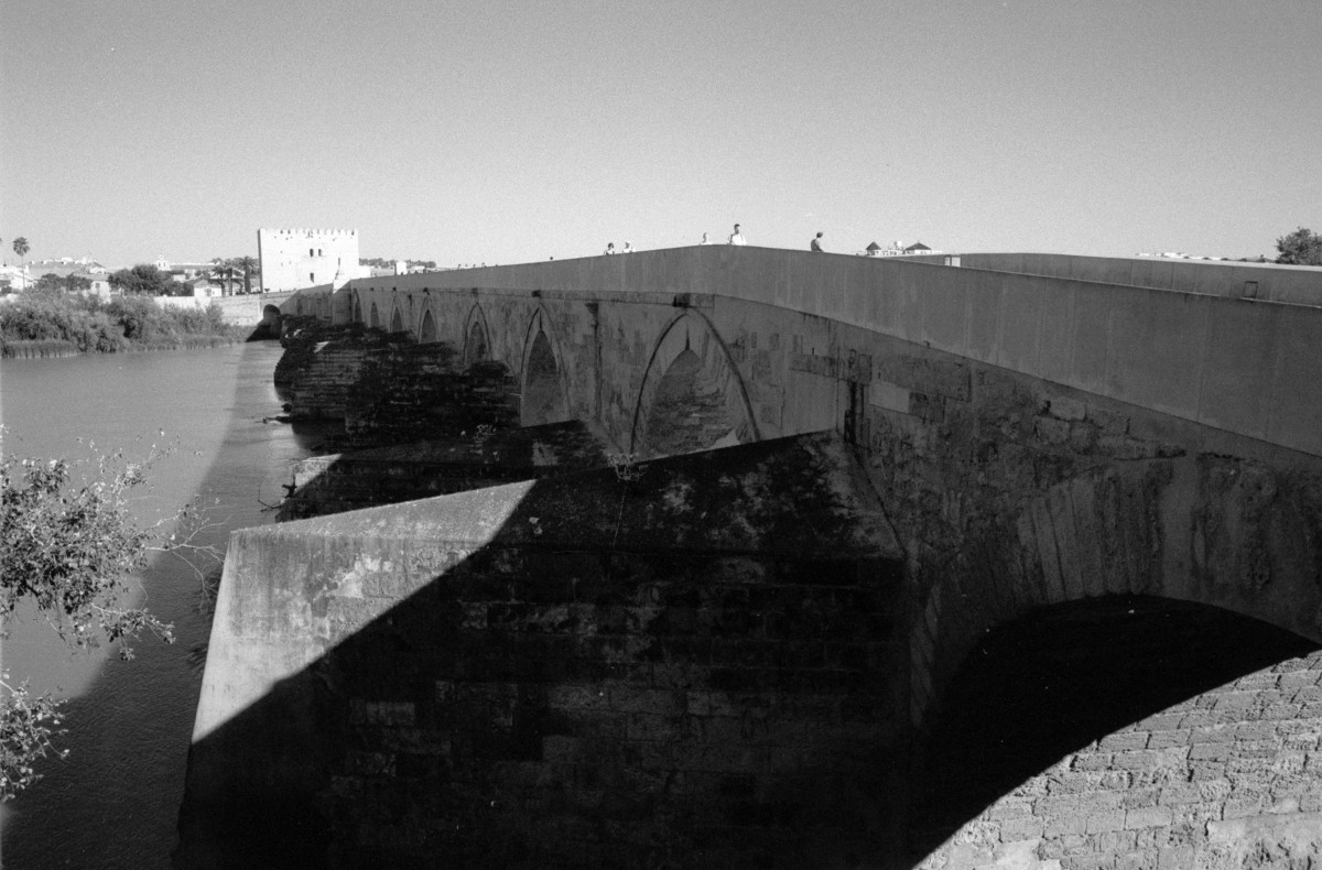 irgendwann geht einem dann doch auch mal die Puste aus. Wir müssen früh los, um unseren Zug nach Córdoba zu erwischen, zu früh für ein Frühstück im Hotel. So nehmen wir dieses in der Filiale einer bekannten amerikanischen Fast Food-Kette zu uns. Wie heisst es so schön? Man gönnt sich ja sonst nichts? Gleich darauf zwei Aha-Effekte. Ein positives und ein zwiespältiges. Um zu unserem Schnellzug zu gelangen, muss man durch eine Sicherheitsschleuse hindurch, so wie man es von Flughäfen her kennt. Das Gepäck wird durchleuchtet. Auf das war ich natürlich nicht vorbereitet und schlagartig realisiere ich, dass meine Schwarzweissfilme ja völlig ungeschützt sind. Ob die mit der Strahlung klar kommen oder ob ich die Fotos vergessen kann? Das war das zwiespältige Erlebnis. Um nicht am Ende der Reise schlimmstenfalls ganz ohne Fotos dazustehen, beschliesse ich, parallel zur analogen Fotokamera, in diesem Fall meine abgeschabte Konica Autoreflex T4, auch mit dem Mobiltelefon zu fotografieren. Da dabei auch Bilder entstanden sind, die mir gefallen, werde ich zu jedem Reisetag eine Seite mit den farbigen Bildern erstellen. Doch wie man sieht, haben die Schwarzweissfilme keinen Schaden genommen. Das positive Erlebnis ist der Hochgeschwindigkeitszug, mit dem wir in den Süden rauschen: Die Sitze in schwarzem Leder gehalten, viel Beinfreiheit, alles sehr modern und sauber. Da staunt man nicht schlecht. Der Wetterbericht, den wir gestern noch mitbekommen haben, hat uns auf hohe Temperaturen in Andalusien vorbereitet. Ausgerechnet Córdoba ist der heisseste Ort. Von neununddreissig Grad ist die Rede. Und wirklich: Je weiter wir mit dem Zug nach Süden vorankommen, desto höher klettert die Temperaturanzeige auf dem Display im Waggon, das die Aussentemperatur anzeigt. Bald sind wir jenseits der 30 Grad-Grenze. Und die Geschwindigkeit des Zugs bei annähernd 300 Km/h. Eine Zugfahrt quer durch Spanien bietet vor allen Dingen eines: grossartige Landschaften! Schroffe Mittelgebirge, schier endlos weite Ebenen mit Getreideanbau, dann wieder Gegenden, die man aus Wildwestfilmen zu kennen scheint, aus Utah, Arizona oder Nevada. Grosse Ländereien, menschenleer wirkend, manchmal mit einsam liegenden Gehöften. Ortschaften, Städte, von einer Burg oder einer grossen Kirche überragt. Je weiter wir nach Süden kommen desto trockener wird es. Um die Mittagszeit läuft unser Zug im Bahnhof zu Córdoba ein und wir beziehen unser Hotelzimmer mitten in der Altstadt. Und ja, es ist heiss hier. Die Notwendigkeit einer Siesta wird einem schlagartig klar. Auch wir brechen erst in den frühen Abendstunden zu einem ersten Erkundungsgang auf. Die Hitze macht einen träge und wir laufen wie in Trance durch die weisse Stadt. In unserem Quartier ist es relativ ruhig, aber in der Nähe der Mezquita ist es - natürlich - sehr touristisch. Die Bustouristen, die wir an den nächsten beiden Tagen sehen werden, sind allerdings um diese Tageszeit schon wieder verschwunden. Die Mezquita selber ist heute geschlossen. Der Anlass für die Schliessung ist die Hochzeit eines Paares, dass es sich anscheinend leisten kann, sich hier das Jawort zu geben. Wir kommen gerade zum Défilé der Gäste, die sich alle ziemlich in Schale geworfen haben. Ausserdem sind viele Frauen in den typischen Flamencokleider unterwegs. Man weiss nicht so recht, ob die "echt" sind und Einheimischen gehören, oder ob es sich um diese Art billige Fake-Tracht für Touristen handelt, wie man das auch vom Münchner Oktoberfest her kennt. Wir statten dem Guadalquivir einen Besuch ab, betrachten die alte Römerbrücke, und landen schliesslich auf dem Plaza de las Tendillas, einem Platz, der für die ihn umgebenden Gebäude irgendwie zu klein wirkt. Und ganz später, schon auf dem Heimweg, gibt es noch einen letzten Boxenstop. Nur einen Katzensprung von unserem Hotel - wie eigentlich fast überall in der Altstadt - hat man auf der ganzen Strassenbreite Stühle und Tische aufgebaut, dort sitzt man immer noch und isst und trinkt und erfreut sich des Lebens. Wir setzen uns an einen freien Tisch und tun dasselbe. |