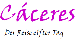 hier wohl etwas Nachwuchsprobleme. Es ist angenehm, hier auf dem grossen Platz zu sitzen und die Zeit verstreichen zu lassen. Auch dieser Platz ist autofrei, wie wir das schon in Córdoba und Sevilla erlebt haben. Das trägt natürlich auch zur Entspannung bei. Einige Wanderer sind unterwegs. Ein Pilgerweg, der Via de la Plata, der von Sevilla bis nach Santiago de Compostela führt, berührt Cáceres. In unserem Hotel logiert gerade jemand, der diesen Weg absolviert. Ausserdem sieht man auch Radfahrer mit Gepäck. Im Laufe des Nachmittags kristallisiert sich auch heraus, wie wir die Reise weiterführen werden: Übermorgen, am Dienstag, möchten wir mit dem Bus nach Trujillo reisen und diese Stadt besichtigen. Ein Hotelzimmer haben wir am Nachmittag gebucht. Tags drauf soll es dann nach Madrid gehen. |