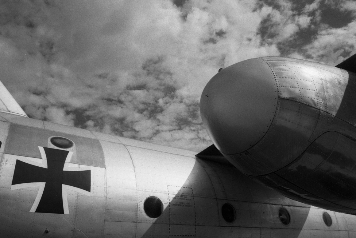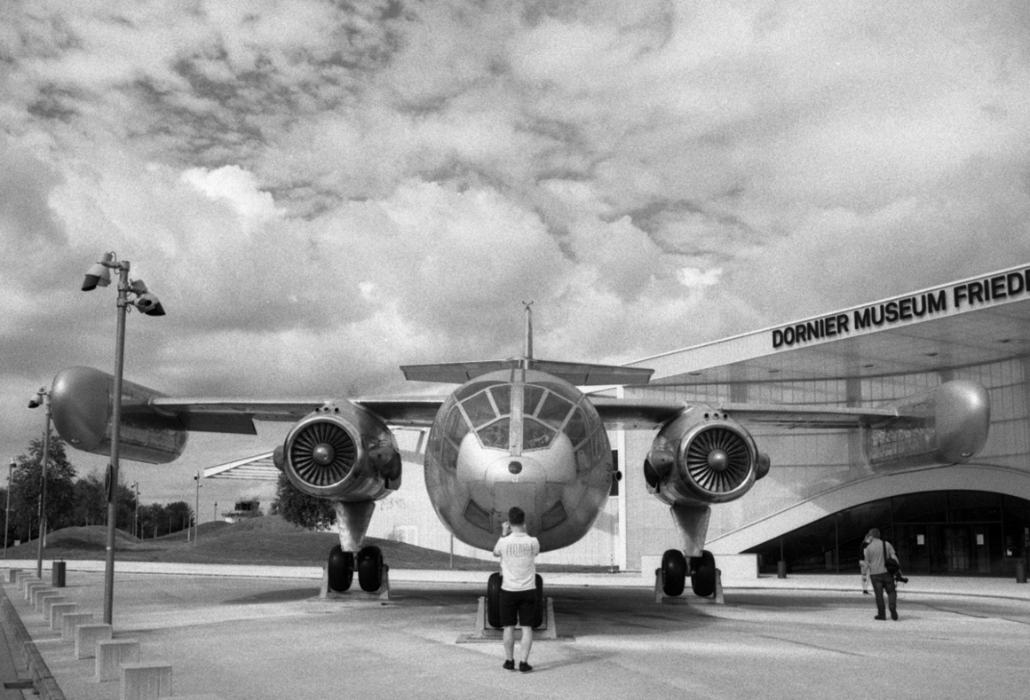 die Geräuschkulisse, die einen permanent begleitet. Gestern Abend noch dieser verheissungsvolle Sonnenuntergang. Und heute morgen ist es trüb. Wir rollen zuerst noch eine Weile direkt am See entlang - die landschaftlich schönsten Kilometer des heutigen Tages - bevor wir allmählich in das Einzugsgebiet von Friedrichshafen kommen. In Immenstaad haben sie die Innenstadt renoviert. Oder zumindesten bilden wir uns das ein. Dann halt Friedrichshafen, wo wir den Wegweisern nach Ravensburg folgen. Es geht nach Norden aus der Stadt. Wir kommen am Dornier-Museeum vorbei, und ich verlustiere mich mit der Kamera ein wenig an dem Flugzeug, das sie vor dem Museumseingang aufgestellt haben. Recht zeitig kommen wir in Ravensburg an, essen zu Mittag, checken in unser Hotel ein, gönnen uns eine Siesta, und brechen nachher wieder zu einer Sightseeingrunde auf. Schliesslich ist Ravensburg ja auch ein sehenswertes Städtchen. Das Wetter hat sich mittlerweile gebessert. Mit dem Sonnenlicht kommt die Lust am Fotografieren zurück und damit allmählich auch wieder die Lebensfreude. Hoffentlich ein gutes Omen für den weiteren Verlauf der Reise. Meine alte Konica Autoreflex T4 war beim Service, und zuhause, als ich die Filme dieser Reise entwickle und einscanne, sehe ich mit Freude, dass die Belichtungszeiten wieder funktionieren und die alte Dame wieder lichtdicht ist. |