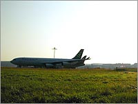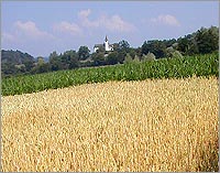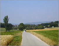 Da ich im letzten Drittel dieses Abschnittes ohne grosse Anstrengung permanent um die dreissig Stundenkilometer fahren kann, bin ich flugs am Rhein. Dort werde ich natürlich durch die leicht hügelige Streckenführung erstmal wieder runtergebremst - das fühlt sich so an, als ob man lange auf der Autobahn fährt und dann plötzlich wieder auf Landstrassen-Tempo herunter muss, also recht langsam. In Eglisau den Fluss überquert. Drüben wartet diese harsche Steigung auf das Plateau des Rafzer Feldes auf mich. Insgesamt mag die wohl nur zweihundert Meter lang sein, aber es kostet mich ziemlich viel Kraft, zumal es jetzt schon wieder recht schwül wird. So bin ich oben auf der Ebene erstmal am Verschnaufen. Und hier sieht's staubig aus. Das liegt am Steinbruch und an den vielen Lastwagen die dort verkehren. Weiter...Wil Rafz Lottstetten. In Jestetten biege ich in der Ortsmitte nach links ab