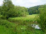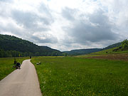 Auf früheren Reisen bin ich immer der Naab entlang weiter gefahren, und nach der Brücke rechts abgebogen. Heute dagegen wende ich mich nach links und folge einem anderen Flüsschen, nämlich der Vils, deren begleitender Radweg mich bis zu meinem Etappenziel, der Stadt Amberg, bringen wird. Bis Schmidmühlen ist dieser Weg asphaltiert und das ist nun wirklich schön: ein kleines Flusstal und optimale Wegführung. Ganze zwölf Kilometer lang ist mir dieses Vergnügen vergönnt, bevor ab Schmiedmühlen wieder mal eine still gelegte Bahntrasse herhalten muss. Das tut der Landschaft zwar keinen Abbruch, schmälert aber durch die einschläfernde Monotonie der oft kerzengeraden Wegführung den Radlgenuss.