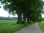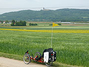 Eigentlich ist mir das Lied während der letzten Phase der heutigen Tagesetappe in den Sinn gekommen, mit dem Blick auf Kloster Vierzehnheiligen, Kloster Banz und dem Staffelberg, dem Berg der Franken. Heute war eine schöne und flotte Etappe und ich mache von Anfang an alles richtig. Nur dass ich mich nach dem Frühstück in vollem Ornat mitsamt der ungeliebten Gamaschen präsentiere, erweist sich schnell als überflüssig, denn der zuerst gar heftigst niederprasselnde Regen aus dunklem Gewölk lässt nach, kaum dass ich zwei oder drei Kilometer gefahren bin. Den Supermarkt am Wegesrand, da rolle ich grad durch Bayreuther Vororte, besuche ich diesmal ausgiebig und kann anschliessend die Regensachen wieder verstauen. Zügig verschwindet die Stadt hinter mir, der Maintalradweg ist gut ausgeschildert und der Kletterspass zwischen Altenplos und Neudrosselfeld wärmt mich auf, bevor ich bis nach Melkendorf so flott dahinrolle, dass ich gar nicht weiss, wie mir geschieht. Vor mir tut der Himmel langsam auf und hinter mir dräut immer noch die dunkle Regenfront. Der Wind frischt auf und kommt erneut aus Osten und treibt mich zusätzlich voran. Zwischen