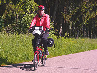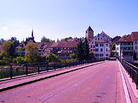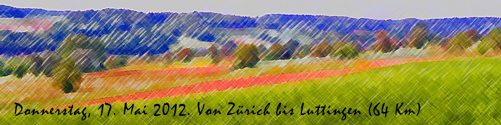herum sitzen, wenn man eh schon reisefertig ist? Wie üblich bei Nordabflug gilt es erst den Bahnhof Oerlikon zu unterqueren und durch das "Glasscherbenviertel" jenseits des Bahnhofes zu rollen. Hier findet ein reges Nachtleben mit den dazugehörigen Auswüchsen statt und deswegen fährt man morgens entweder durch ausgedehnte Scherbenfelder oder kommt manchmal - durchaus auch bis in den späten Vormittag hinein - in Kontakt mit diversen Individuen, die den Weg (noch) nicht nach Hause gefunden haben. Jeder kann sich denken warum. Hat man das ohne Reifenpanne hinter sich gebracht, folgen die ersten Kilometer auf dem Radweg entlang der Glatt in Richtung Rhein. Hier gibt es sowohl kurze Kletterpartien als auch Naturwege mit teilweise ruppiger Oberfläche, man hat im Prinzip also einen Vorgeschmack darauf, was in den nächsten Tagen und Wochen auf einen zukommen mag. Wir können schon mal das Verhalten der bepackten Räder beurteilen und dieses Urteil fällt positiv auf. "Basst scho" sagt man dazu in Österreich. Den Flughafen hinter uns lassend, zweigen wir von der Glatt ab, radeln am Naturschutzzentrum Neerach vorbei und kommen bei Weiach schliesslich an den Rheinradweg. Ein paar Minuten später, in Kaiserstuhl, rollen wir die steile Altstadtgasse hinunter und setzen über den Rhein, der von jetzt an unser Begleiter sein wird. |