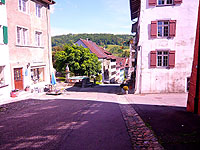 und prosten sich mit funkelndem Rosé zu. Tiengen kommt, dann Waldshut, und für eine Zeit lang schwimmt man mit den motorisierten Verkehrsteilnehmern mit. Später wird es wieder ruhig, weil man auf eine langgezogene Insel im Rhein geschickt wird, auf der sich nur Radfahrer und Fussgänger vergnügen dürfen. Mittags findet man uns auf genau dem Campingplatz, auf dem wir damals während unserer Hochzeitsreise mal einen Pausentag bei strömenden Regen verbrachten. Hier gibt's nicht nur die ersehnte Zwischenmahlzeit, man wird auch schon um die Mittagszeit mit lauter Technomusik beschallt. Hmmm, schade. Immerhin reduzieren sie die Lautstärke auf Anfrage auf ein halbwegs erträgliches Mass, dabei beschleicht uns allerdings das Gefühl, regelrechte Spielverderber zu sein. Das Etappenende kommt unaufhörlich näher und wir checken in einem Landgasthof in Luttingen, das liegt kurz vor Laufenburg, ein. Wir verbringen den Rest des Tages im mit viel Liebe angelegten Innenhof, immer knapp am Frösteln, denn heute bleibt es trotz Sonnenschein den ganzen Tag über recht kühl. |