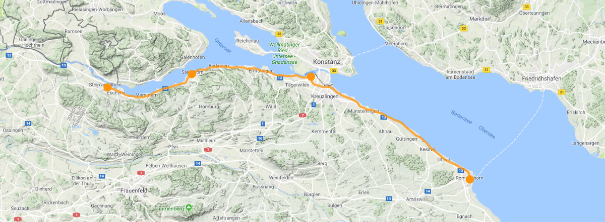 öffnet. In Mammern gibt es eine Mittagspause in einer Wirtschaft fast direkt gegenüber dem Hotel Adler, in dem ich bei meiner ersten Liegevelotour 2004 eingekehrt bin. Das Hotel habe vor einiger Zeit dicht gemacht, erzählt uns die Bedienung. Damals hatte ein junges Ehepaar den Betrieb erst vor kurzem übernommen, wenn mich nicht alles täuscht. Was da wohl passiert ist? Im Laufe des Nachmittags treffen wir in unserem Hotel kurz vor Steckborn ein und verbringen den Rest des Tages am See. Auf der anderen Seeseite liegt die Halbinsel Höri, also Deutschland. Ich frag mich, wie es den Schweizern hier während des zweiten Weltkrieges zu Mute war, als Krieg und Frieden nur durch ein paar hundert Meter Wasserfläche getrennt waren. |