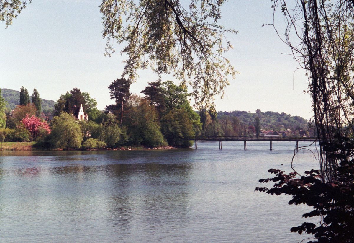 dort aus weiter gehen, und zwar immer schön auf der Südseite des Sees entlang. Die Gepäckmitnahme bei Radreisen haben wir längst schon optimiert. Wie sieht es aber bei Wanderungen aus, wenn nicht die Tragfähigkeit des Gepäckträgers das Limit setzt, sondern der eigene Rücken? Mit allem Pipapo komme ich letztendlich auf 8 Kg Gepäck, inklusive gefüllter Trinkflasche, Tagebuch, Lektüre und der schweren russischen Zorki Kamera samt Filmen und dem Werkzeug, dass ich zum Wechseln des Filmes brauche (die russische Prinzessin ist spröde...). Auf dem Weg zum Bahnhof kommt uns das ungewohnte Gewicht noch bedenklich vor, allmählich gewöhnt man sich aber daran - ähnlich wie beim Radreisen. Die S-Bahn bringt uns nach Stein am Rhein. Erst letztes Wochenende sind wir hier mit dem Kursschiff durchgefahren, eine ganz andere Art von Unternehmung. Heute dagegen steigen wir, zusammen mit einer Menge Touristen, Ausflüglern und Radfahrern, im Bahnhof Stein am Rhein aus und wanderen hinunter zum Fluss. |